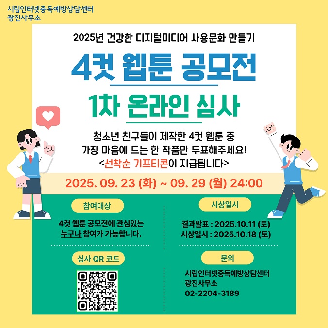 2025년 4컷 웹툰 공모전 1차 온라인 심사 안내 (~9/16까지, 선착순 기프티콘 지급) | |||